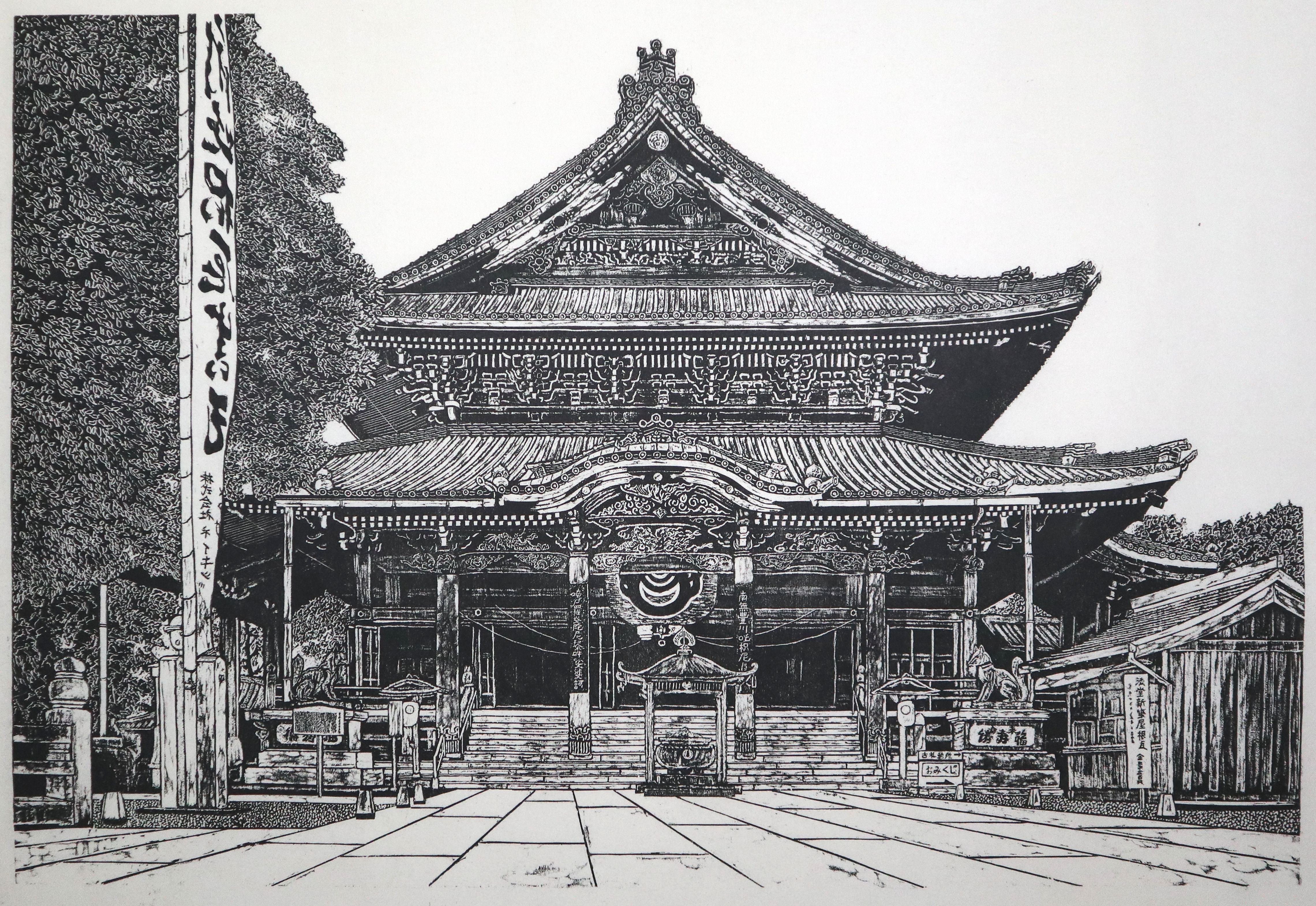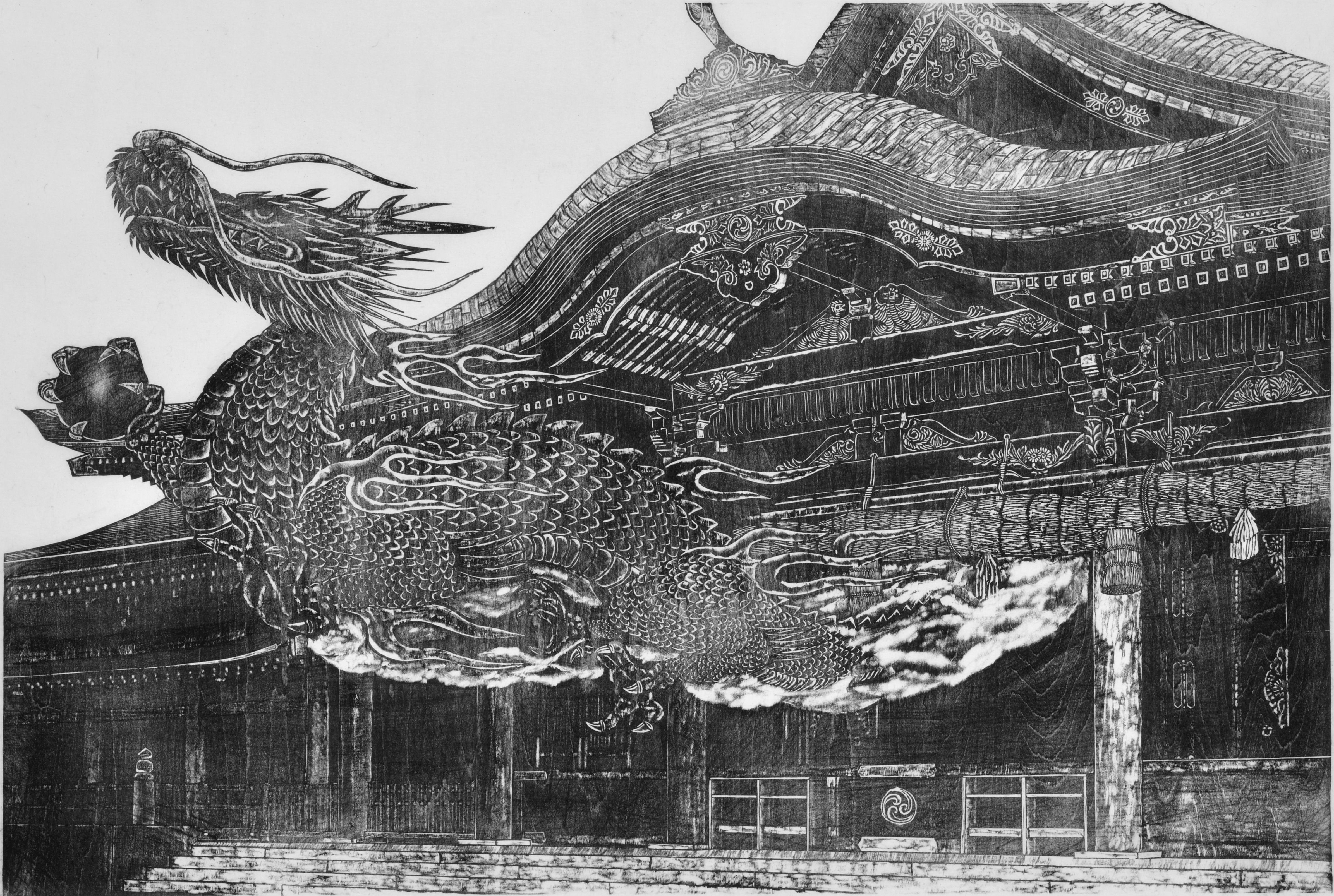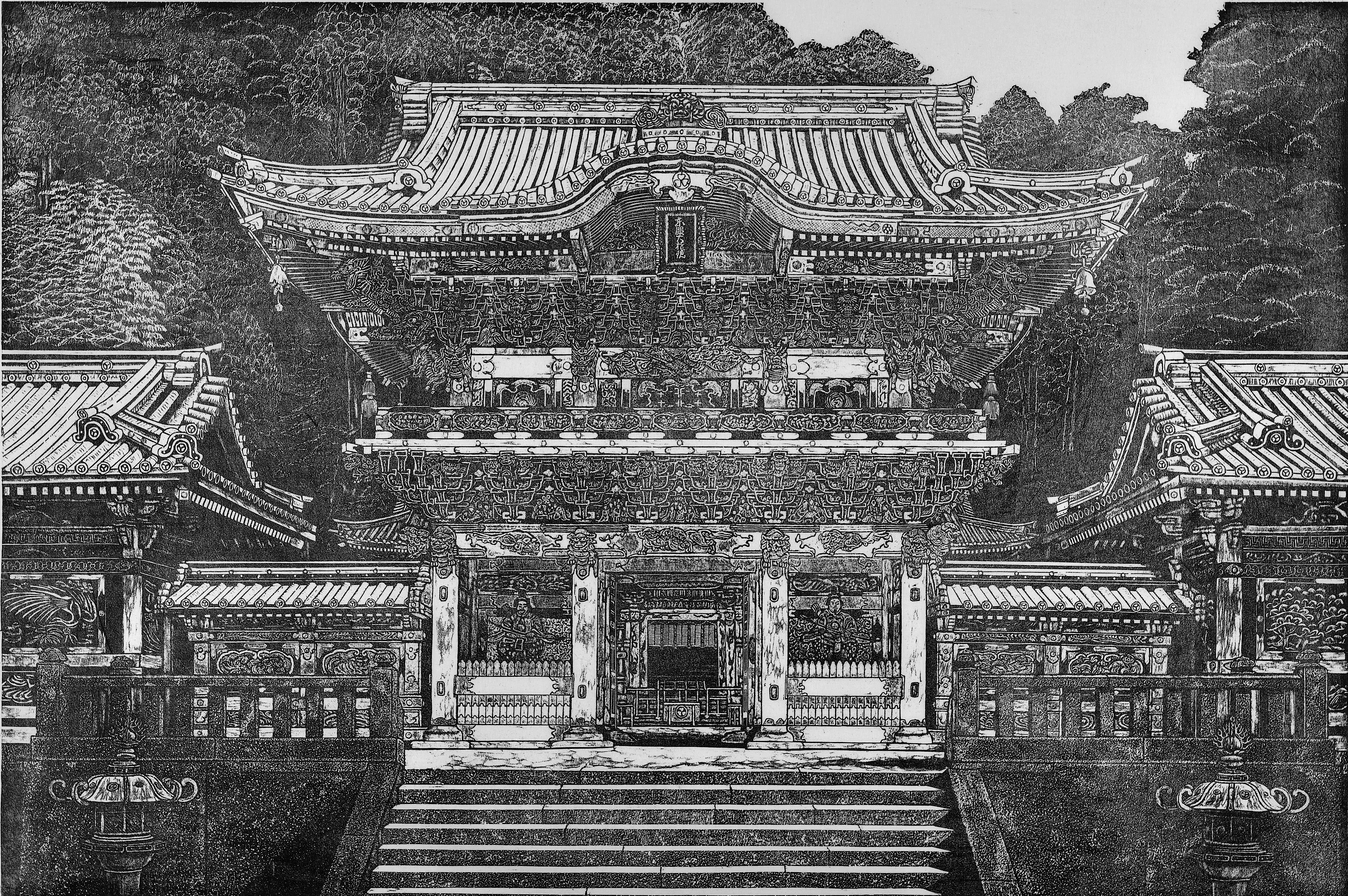 修復作業が完成した日光東照宮の陽明門をモチーフにした作品です。金色に輝く屋根、鮮やかな色彩が塗られた彫刻群、その荘厳で煌びやかな姿を白黒で如何に表現するかがこの作品の命題でした。またまばゆいばかりの金色と胡粉で真っ白に塗られた部分をどのように彫り分けて表現するかにも悩みました。
