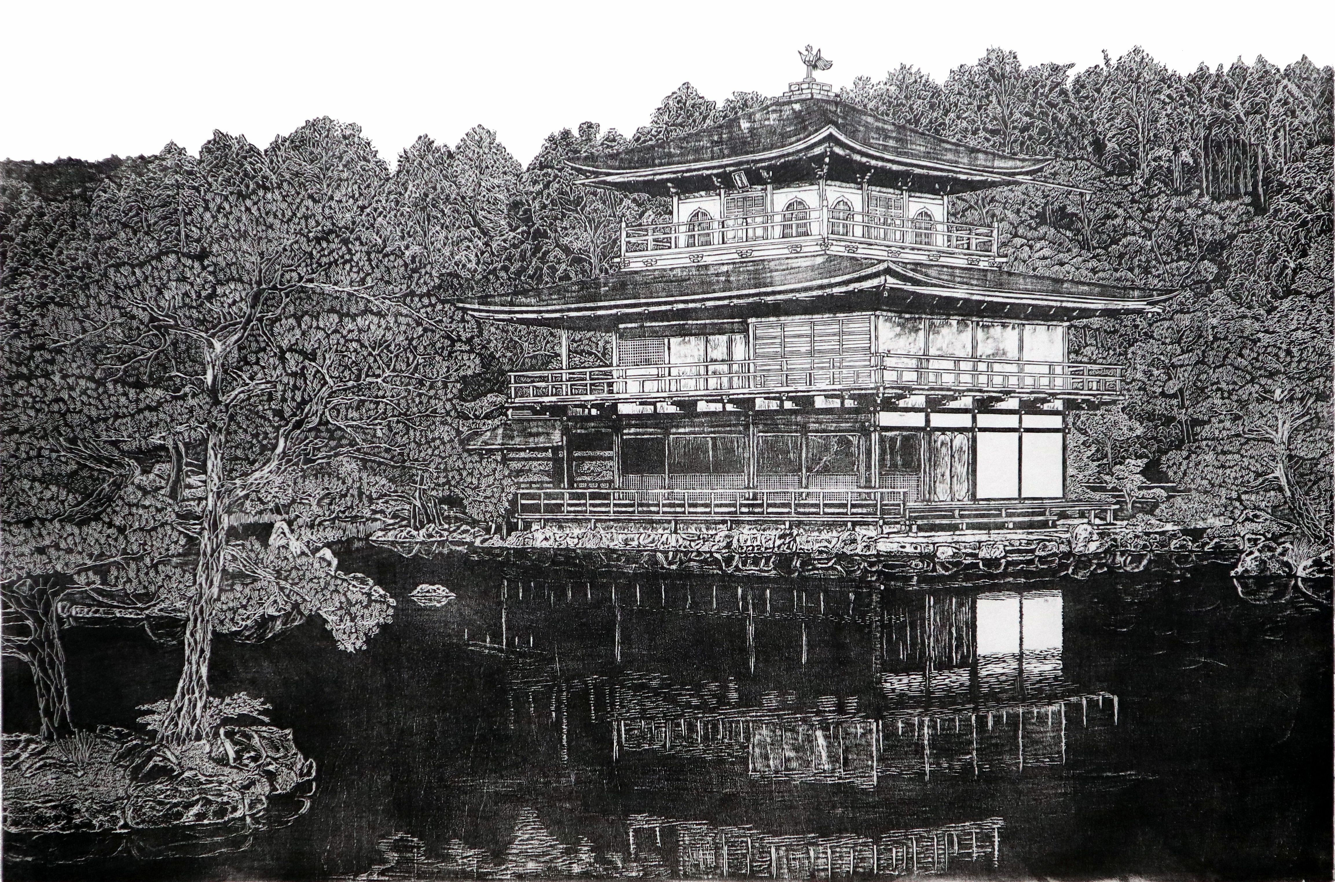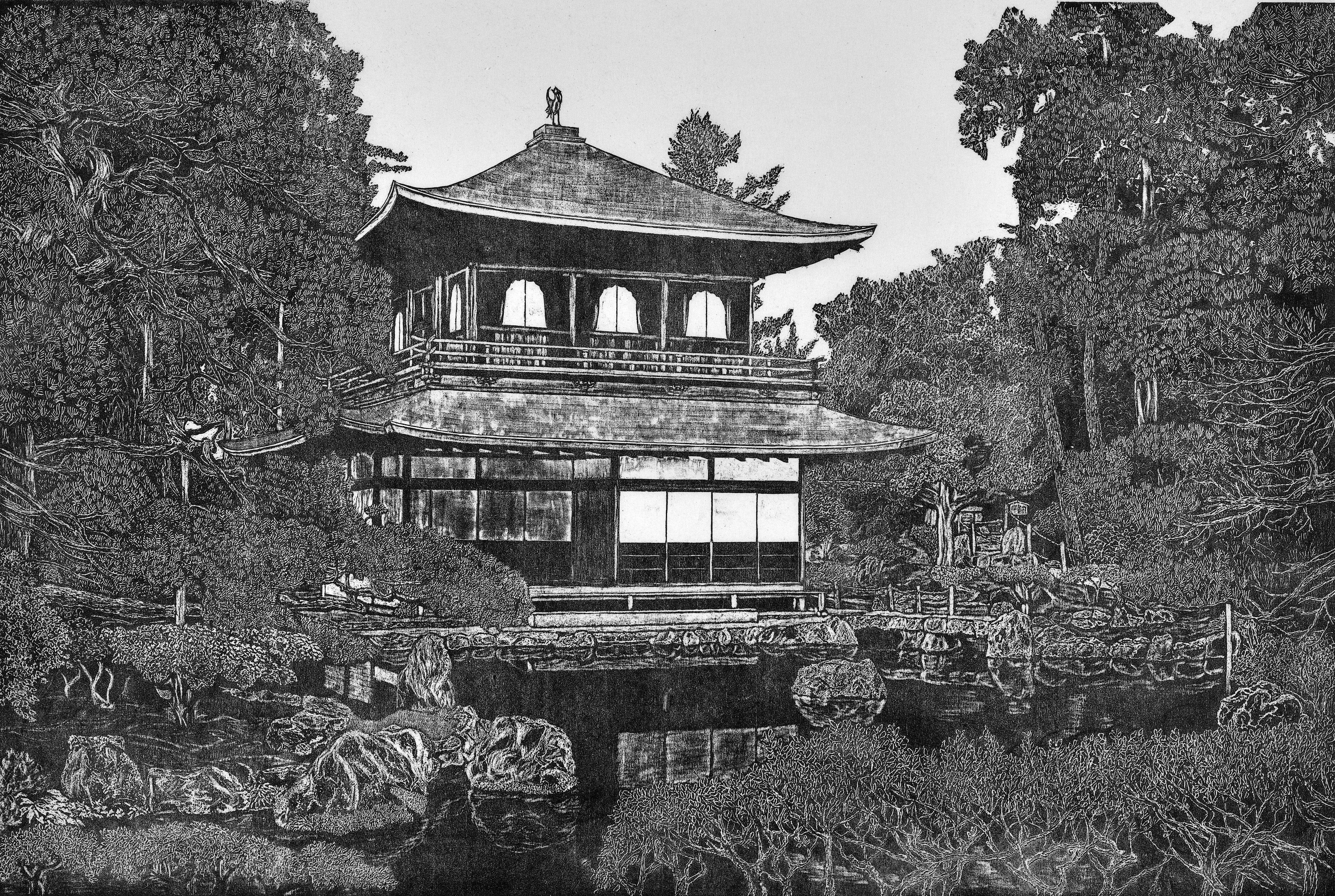 京都の金閣寺を題材にした作品です。金閣寺は名前の通り金箔で覆われた荘厳な建物で、そのきらびやかさを如何に表現するかかなり悩んだ作品です。作品に金箔を貼り込むことも考えましたが、逆にバランスを崩すことになるのでここは思い切って白黒で摺り分けて見ました。周りの木々の緑と金色の建物の色を感じ取っていただければ幸甚です。また鏡湖池に映り込む建物が水面の波紋で揺らぐ様子を再現しております。