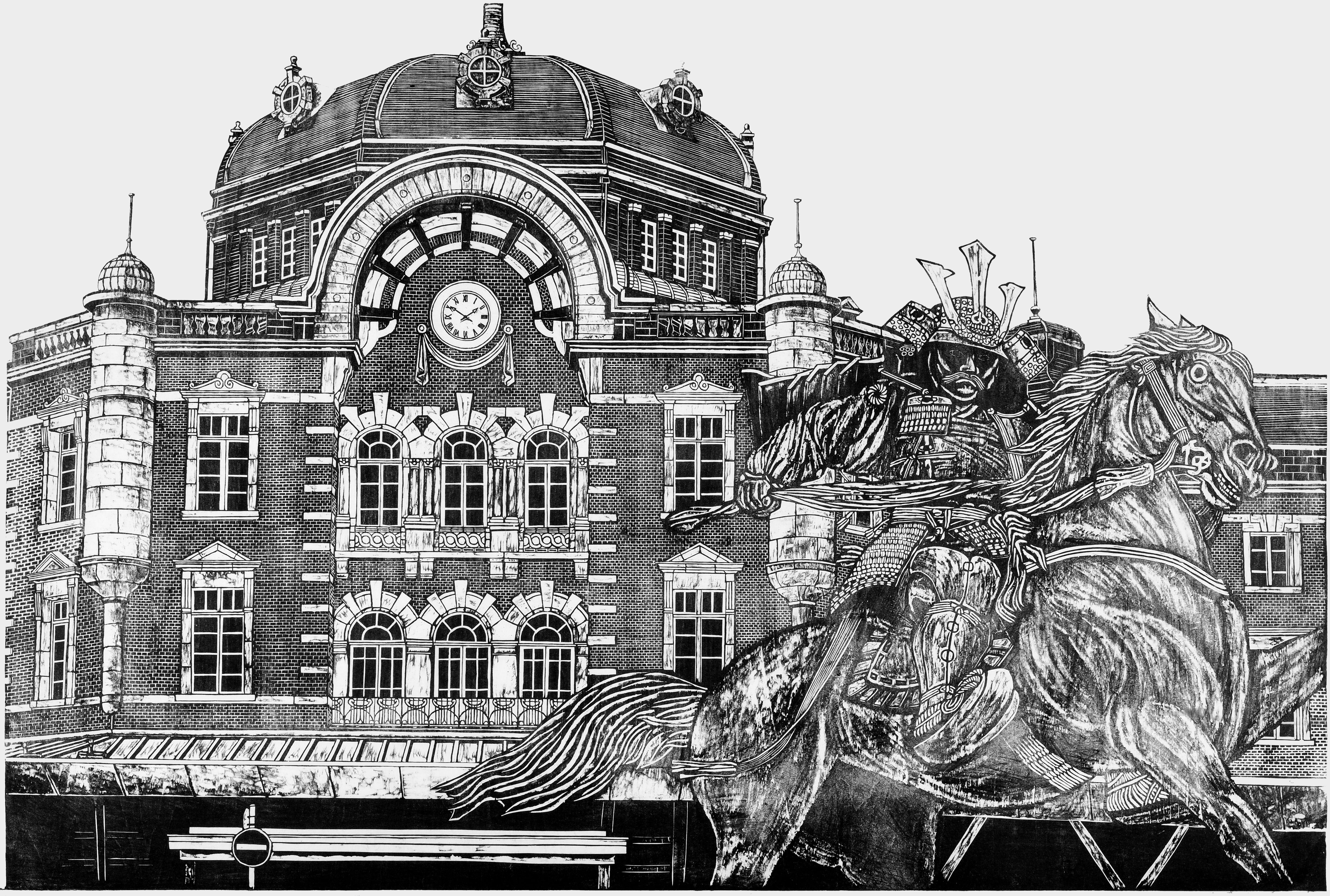東京駅の前に楠木正成像を配した構図で東京駅の精緻さと正成像の優雅さを対比させ、彫り方を変える事でそれぞれの特徴的な質感を表現しています。